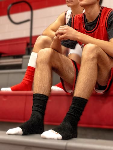 • COMFORTABLE QUALITY CONSTRUCTION: These youth basketball socks boys sizes and girls sizes feature, ergonomic cushioning and arch compression that helps the sock stay in place and give the foot support during games or practice. Double welt top at the top of the sock ensures the sock stays up around the calf and doesn't slip down. Made with 66% Polypropylene, 25% Polyester, 7% Rubber, 2% Spandex for maximum durability and athletic performance.