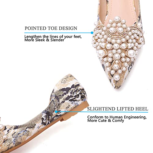 • 【Dress shoes that are easy to match】: Soft PU upper,cute lace appliques,shiny pearls,closed pointed toe,slip on ,which are perfect outfit with office suits,dresses,shorts,jeans,leggings,skirts and other casual wear.