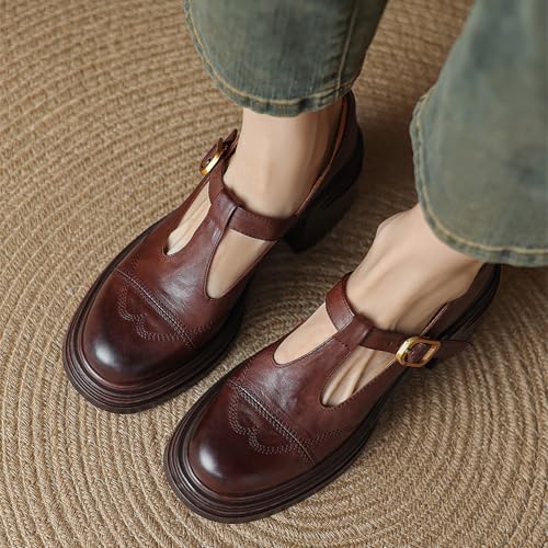 More information about Women's Leather Wingtip Chunky Heel Mary Janes Comfort Round Toe T-Strap Platform Block Heel Retro Dress Shoes Party Evening Dating Mary Jane Pumps