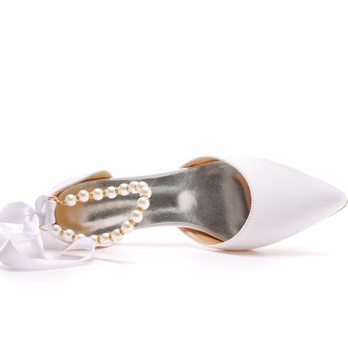 Women's Pointed Toe Pearl Ribbon Chunky Heel Pumps,Low Heel Satin Bow Heels,Wedding Shoes for Bride,Light Comfortable Fashion Evening Dress Shoes 7