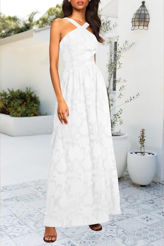 • 【MAXI DRESS FOR WOMEN 2025】This formal maxi dress with a burnout floral design throughout, that shapes a modified halter neckline with wide tank straps and a sleeveless princess-seamed bodice. A high, banded elastic waist an A-line silhouette before cascading down to a maxi-length skirt