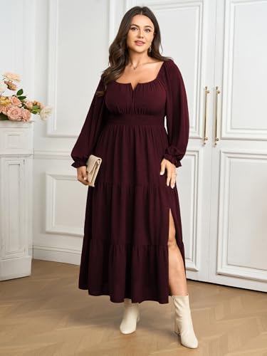 SCOMCHIC Womens Plus Size Formal Dress Fall Long Sleeve Square Neck Flowy A Line Tiered Side Split Wedding Guest Maxi Dress 6