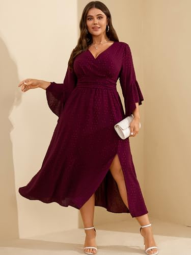 RWJ Women Plus Size Wedding Guest Maxi Dress Summer Wrap V Neck Ruffle 3/4 Sleeve Swiss Dot Slit Cocktail Dresses 4