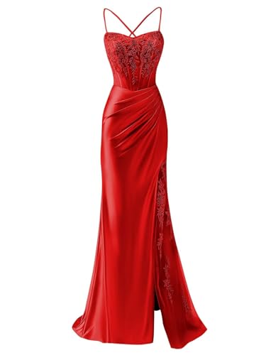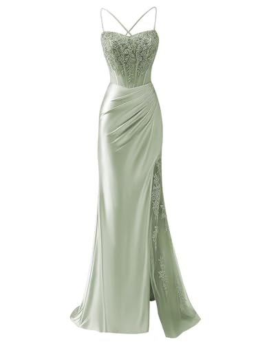• FEATURES: The long corset prom dress, with spaghetti straps, sweetheart neck, ruched, pleated, mermaid bodycon silhouette, empire waist, high waist, train, side split with lace appliques, floor length, lace up back, fully lined and built-in bra