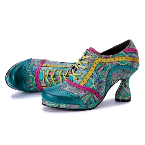 CrazycatZ Women's Bright Color Patchwork Studded Leather & Fabric Chunky Block Heel Pumps - Retro Party Dress Shoes 1