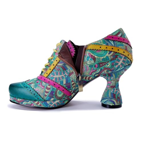 More information about CrazycatZ Women's Bright Color Patchwork Studded Leather & Fabric Chunky Block Heel Pumps - Retro Party Dress Shoes