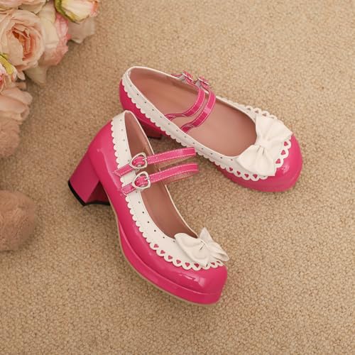 • 【Kawaii Bow Design】: The lolita chunky heels feature a round toe, two straps with love buckle style, a kawaii bow design, Color: Black,White,Pink and Hot Pink. all colors for lolita shoes,cosplay shoes,kawaii shoes. best cute shoes for you. These lolita shoes will match any outfit you wear. like cospaly dresses,skirts,capris and shorts. It can provide you with the best wearing experience.
