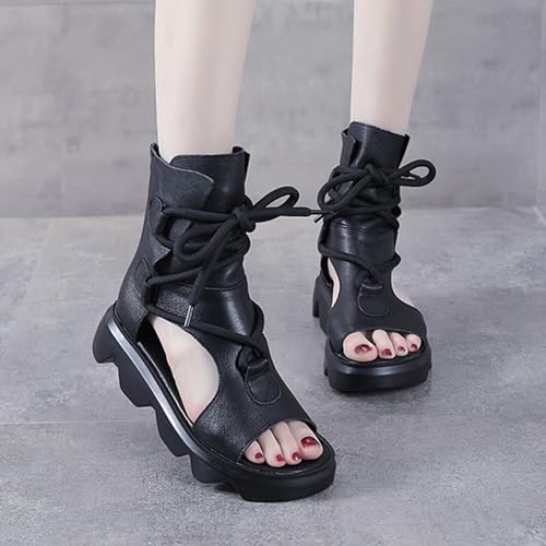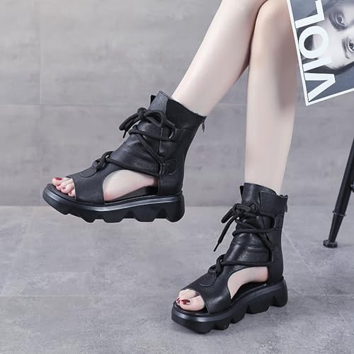 Women's Leather High Top Platform Sandals Vintage Casual Open Toe Lace Up Back Zipper Chunky Wedge Booties Comfortable Soft Sole Roman Sandals 6