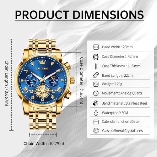 • [Fashion Design Olevs Watch Men] Exquisitely crafted and uniquely designed, this watch has a quartz movement and battery, and the watch's mirror glass is scratch-resistant. The dial has three sub-dials increase the readability of the watch. Meanwhile, the hands of the watch can turn on the luminescent function after being illuminated by strong light for more than 30 seconds, so that you can read the time at night, which brings more convenience to your life.