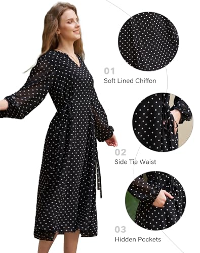 Women's Long Sleeve Midi Dress Spring 2025 Floral Tie Waist Chiffon Polka Dot Work Wedding Guest Dress with Pockets 3