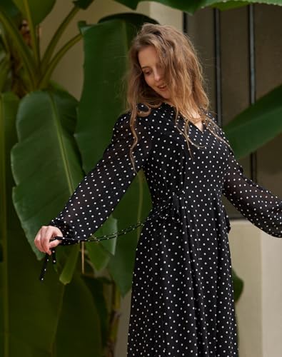 Women's Long Sleeve Midi Dress Spring 2025 Floral Tie Waist Chiffon Polka Dot Work Wedding Guest Dress with Pockets 6