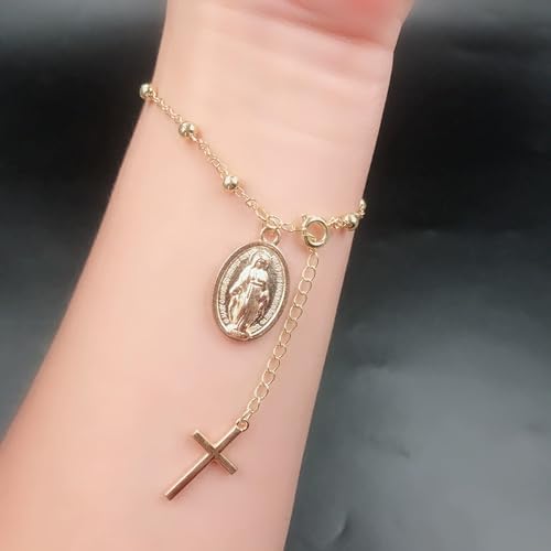 HCTCPALS Gold Silver Bracelet for Women Italian Rosary Bracelet Cross Charm Virgin Mary Coin Pendant Bead Chains Jewelry Gifts 8.7 inches 5