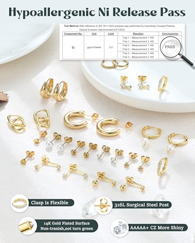 • 14K Gold Plated and Non Tarnish Earrings: These dainty stud hoop earrings surface with 14K gold plated,is more shiny and textured,not easy to fade,and will not turn green! Hoop earrings are made from brass,stud earrings are made with 316L stainless steel post.Hypoallergenic & lightweight, ensuring a long-lasting wearing experience, comfortable wear alone or stacked to all day