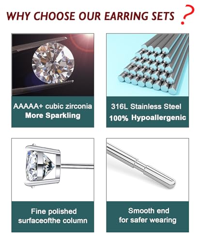 More information about Stud Earrings for Women Men, Hypoallergenic Women's 14K Gold Plated 316L Stainless Steel CZ Studs Earrings Simulated Diamond Round Cubic Zirconia Ear Stud Set