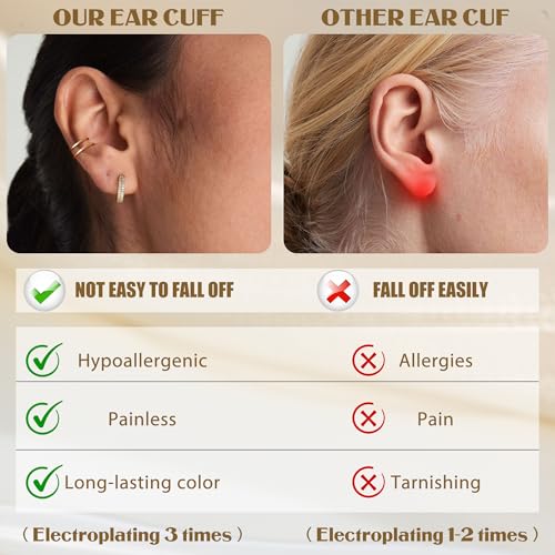 • [Adjustable & Non Piercing Cuff Earrings for Women] These ear cuff earrings are made of copper with 14K gold plating for long-lasting fade resistance, nickel-free and lead-free, hypoallergenic. Great for sensitive ears and no piercing needed