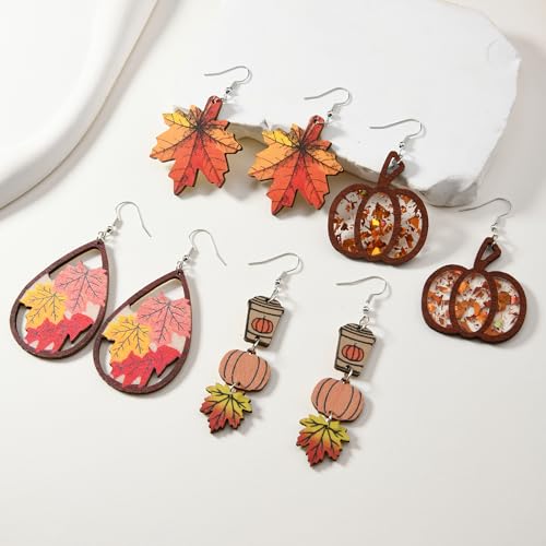 • THANKSGIVING EARRINGS FOR WOMEN: What you will receive are a total of 9 pairs (18pcs) of fall earrings. Various of wooden drop autumn earrings are designed in the theme of Thanksgivings day- they are turkey earring, maple leave earring,pumpkin earring, coffee cup earring. Get into the holiday spirit with this set of various styles cute fall earrings for women