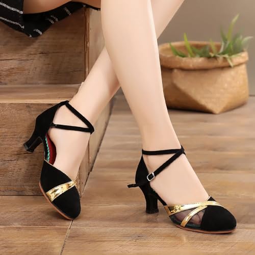 Sandals for Womens Latin Dance Shoes Mesh Rhinestone Heeled Ballroom Salsa Tango Party Sequin Dance Shoes Sandals for Women Dressy Heel (Gold, 8) 6
