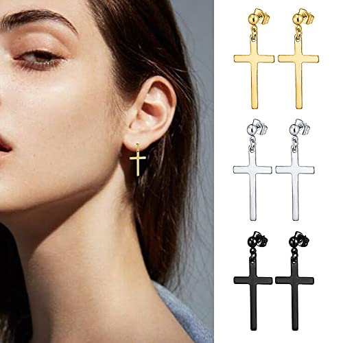 • Premium Cross Earrings Set: A set of men's cross earrings featuring one pair each in black, silver, and gold, crafted from high-quality stainless steel material for durability and hypoallergenic properties.