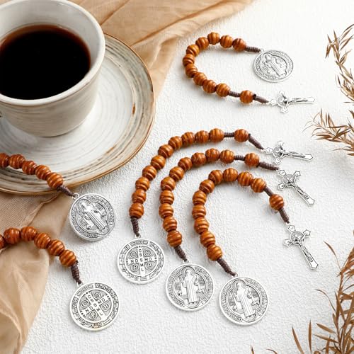 Kigeli 6 Pcs Saint Benedict Medal Prayer Pocket Rosary Catholic Gift for Men Women Bead Wood with Crucifix Christian Religious Gift Solid Wooden Prayer Chaplet with Cross Silver Jesus 6