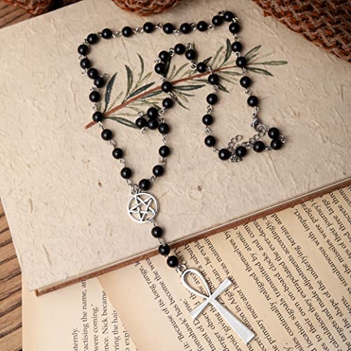 Sacina Gothic Ankh Cross Pentagram Necklace, Bead Chain Rosary Cross Necklace, Goth Jewelry Gift for Women, Men 5