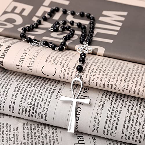 Sacina Gothic Ankh Cross Pentagram Necklace, Bead Chain Rosary Cross Necklace, Goth Jewelry Gift for Women, Men 7