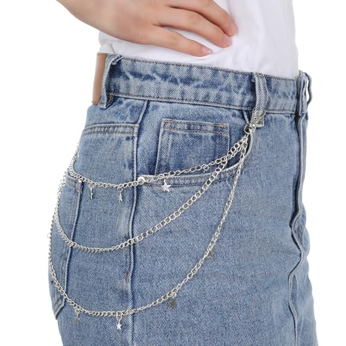 Star Pants Chain Hip Hop Silver Y2k Jeans Belt Chains Cute Vintage Punk Chunky Trouser Pocket Keychains Goth Rock Layered Wallet Jewelry Accessories for Women Men Girls 3