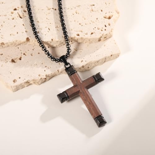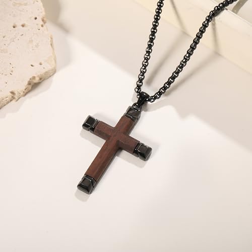 HOT ! Wooden Cross Necklace for Men, Brown Ebony Masculine Mens Cross Necklaces Christian Black Stainless Steel Wood Crucifix Pendant, Includes 24" Box Chain