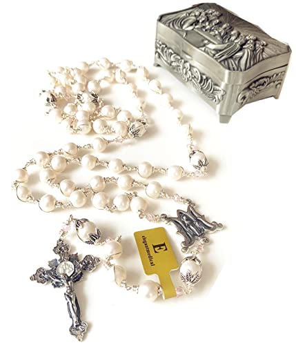 elegantmedical Handmade Sterling Silver White Pearl Beads Catholic Rosary Necklace Cross Crucifix Gift Box 1