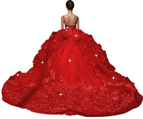 • Design:Spaghetti straps quinceanera dresses ball gown with long train,shiny floral sweet 15 16 dress with bow, gorgeous ruffled 15th quinceanera dress,princess xv long puffy dama dress,pretty tulle prom for women,vestido de 15 años.kindly note:the model in the picture wears underskirt.If you want to achieve the same look as the picture, you can wear a underskirt too.