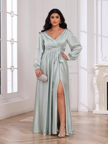 More information about YOFF Long Sleeve Bridesmaid Dresses for Women 2025 V Neck Satin Formal Dresses Evening Gown with Slit YO184