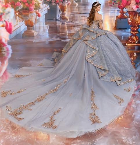 Gold Appliques Quinceanera Dresses with Bow Sweet XV Dress Glitter Puffy Ball Gown with Long Train PM006 1
