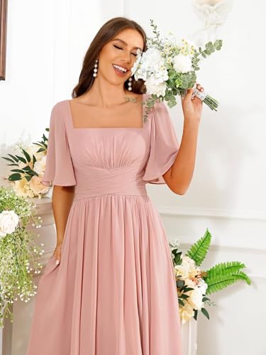 Square Neck Bridesmaid Dresses with Slit Chiffon Flutter Sleeve Long Formal Wedding Guest Dress with Pockets 3