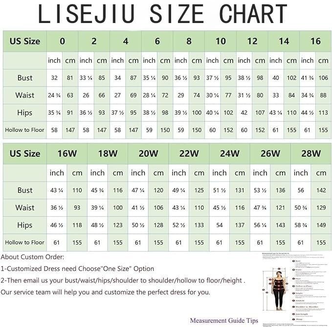 • Size:When you choose a dress,please refer to our size chart image on the left.If our size does not meet your needs,please choose "One Size" and we will customize the dress for you.Customization service is also free.Please provide us with your chest,waist,hip,and hollow to floor measurements when placing an order,and we will tailor them to your specific size.If you have any other requirements regarding clothing,please feel free to contact us at any time.