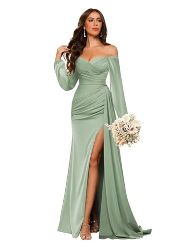 • Design:Long Sleeve Satin Bridesmaid Dress for Women,Mermaid Bridesmaid Dresses with Sleeves,Off The Shoulder Bridesmaid Dresses for Wedding 2025,Satin Long Sleeve Formal Dress for Women Wedding Guest,Off The Shoulder Prom Dresses Long for Women,Floor Length,Pleated,Ruched,Sweetheart, High Split,Fully Lined,Built-in Bra in the Bodice.