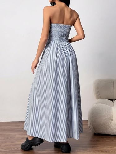 HOT ! SKAYS Womens Striped Strapless Tube Maxi Dress Sexy Back Smocked A Line Vacation Long Dresses with Pocket