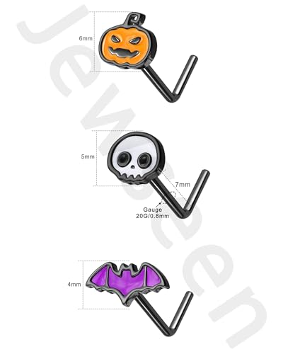 Jewseen 3Pcs Halloween Nose Rings Studs for Women Men 20G Black Nose Piercing Jewelry L Shaped Nostril Piercing Pumpkin Nostril Studs Bat Ghost Nostril Ring Nose Ring Nose Studs 6