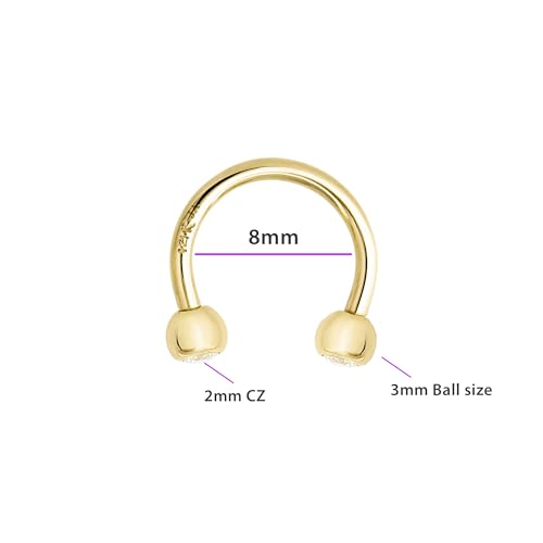 HOT ! 14K Solid Gold Horseshoe Septum Ring – Hypoallergenic Externally Threaded Nose Ring with Bezel-Set Cubic Zirconia (CZ) Ball – 8mm, 10mm