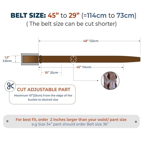 • Belt Size: The total length is 48” (=122cm) excluding the buckle, which suits a 45”- 29” waist. Belt Width is 1.5” (=3.8cm). The belt length can be cut shorter easily because the buckle can be removed. Please measure carefully your waist as per the size chart on the detail page or your current belt size to fit perfectly.