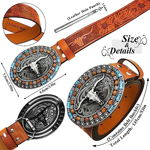 2Pcs Mens Cowboy Leather Bucket Belt and Replaceable Belt Buckles Western Longhorn Bull Belt Floral Strap 4