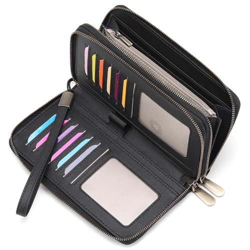 • Dual-zipper Large Capacity Design: The double-zipper wallet has two separate zippered compartments for maximum space for organizing your essentials.24 card slots for all forms of cards, 2 full-length slots for checkbook, or cell phone, 6 interior full-length slots for receipts, or tickets, 1 zipper pocket for change,2 ID windows with central cut-out over, and one pen loop for holding your pen