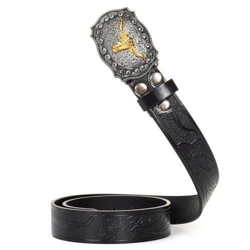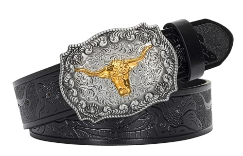 • High-Quality Fabric: Made from PU leather, offer exceptional durability. The zinc alloy buckle features intricate floral and longhorn bull engravings, showcasing exquisite craftsmanship. The belt also includes removable screws for added convenience
