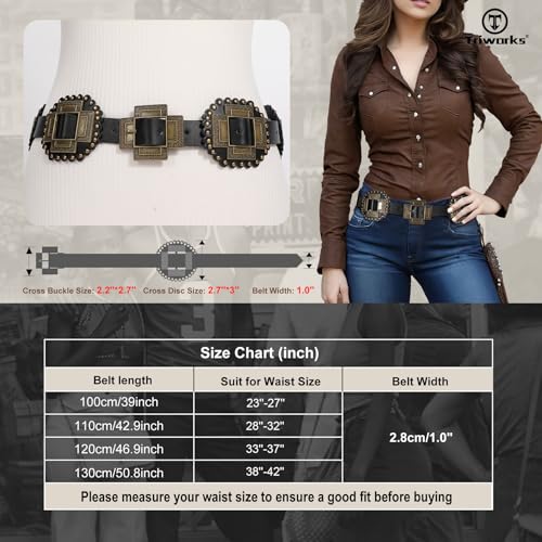 • Cowgirl Belt Size Note: Our black western boho belt suit for pant's width 2.7'', leather belt strap width is 1'', cross disc decoration is 2.7"*3", pin buckle is 2.2"*2.7". Our brown western belt fits most people's waistline, you can choose the right size according to your actual waistline.