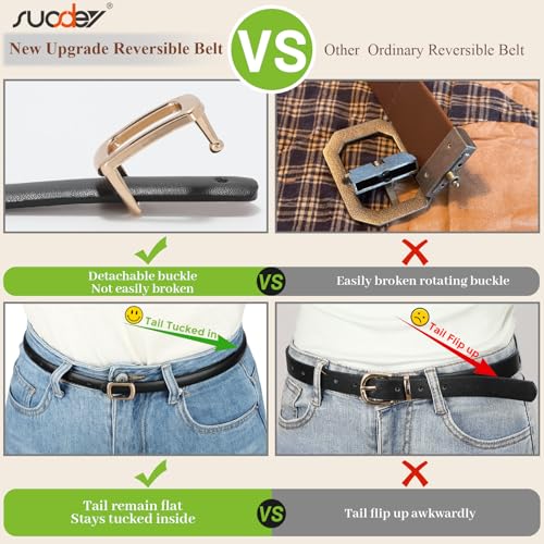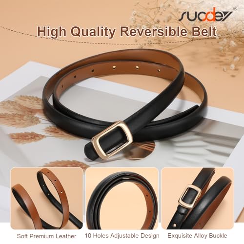 • 🌟 【2 Pack Premium Reversible Leather Belts】 You will get 2 belts but getting 4 colors to use! These skinny leather belts is made of high quality ultra soft leather + most popular durable alloy buckle, which never rust and ensure durability, a sleek appearance, and a comfortable feel.