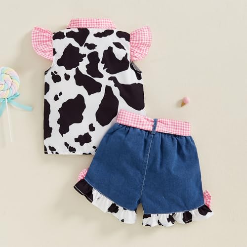 Western Baby Girl Denim Outfits Cow Print Shirt Toddler Ruffle Sleeve Button Down Tops Bowknot Wide Leg Jean Shorts 6
