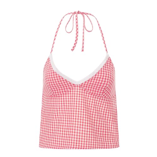 Women Girls Terry Trim V-Neck Halterneck Top Sleeveless Open Back Gingham Tops Strappy Y2K Shirts Streetwear 7