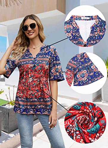 HOCOSIT Women's Floral Print Short Ruffle Sleeve Pleated Front V Neck Button Tunic Tops 2