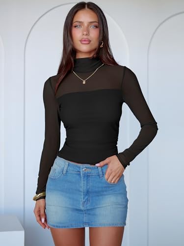More information about ANRABESS Womens Sexy Mesh Long Sleeve Shirts Trendy Mock Neck Sheer Ruched Going Out Tops Fall Slim Fit Blouses 2025