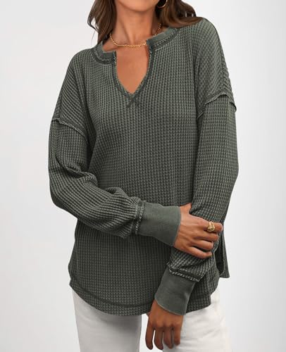 • HIGHLIGHTS: The waffle knit tunic top is soft to the touch and the exposed seam is a chic design to balance the simple plain long sleeve t shirt. Our womens tops featuring drop shoulder to add a slouchy look. The loose fit long sleeve t shirt women with split hem perfect as maternity shirts and the stitching details make this casual v neck shirt women unique and stylish
