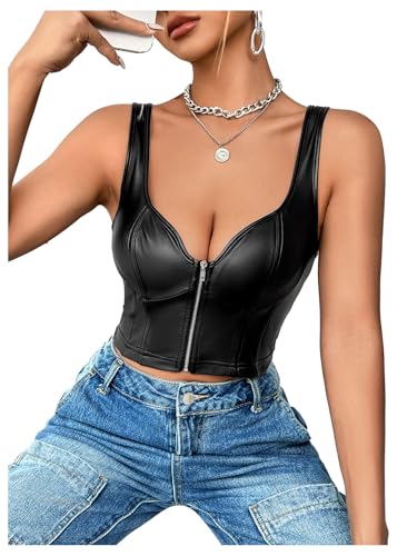 More information about SHENHE Women's Casual Solid Sleeveless Spaghetti Strap Cami PU Leather Backless Crop Tops
