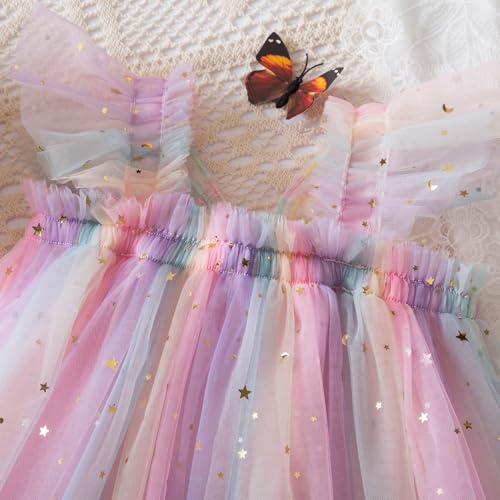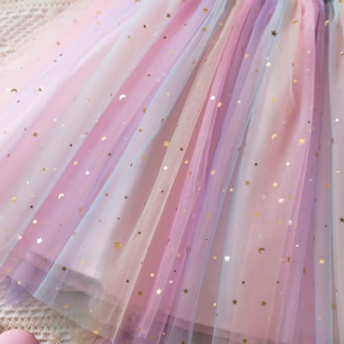 • ★Design: sleeveless, square neck, pull on, elastic bust and elastic shoulder strap, multi-layer lace tutu dress, colorful rainbow, sequin star print, above knee length.